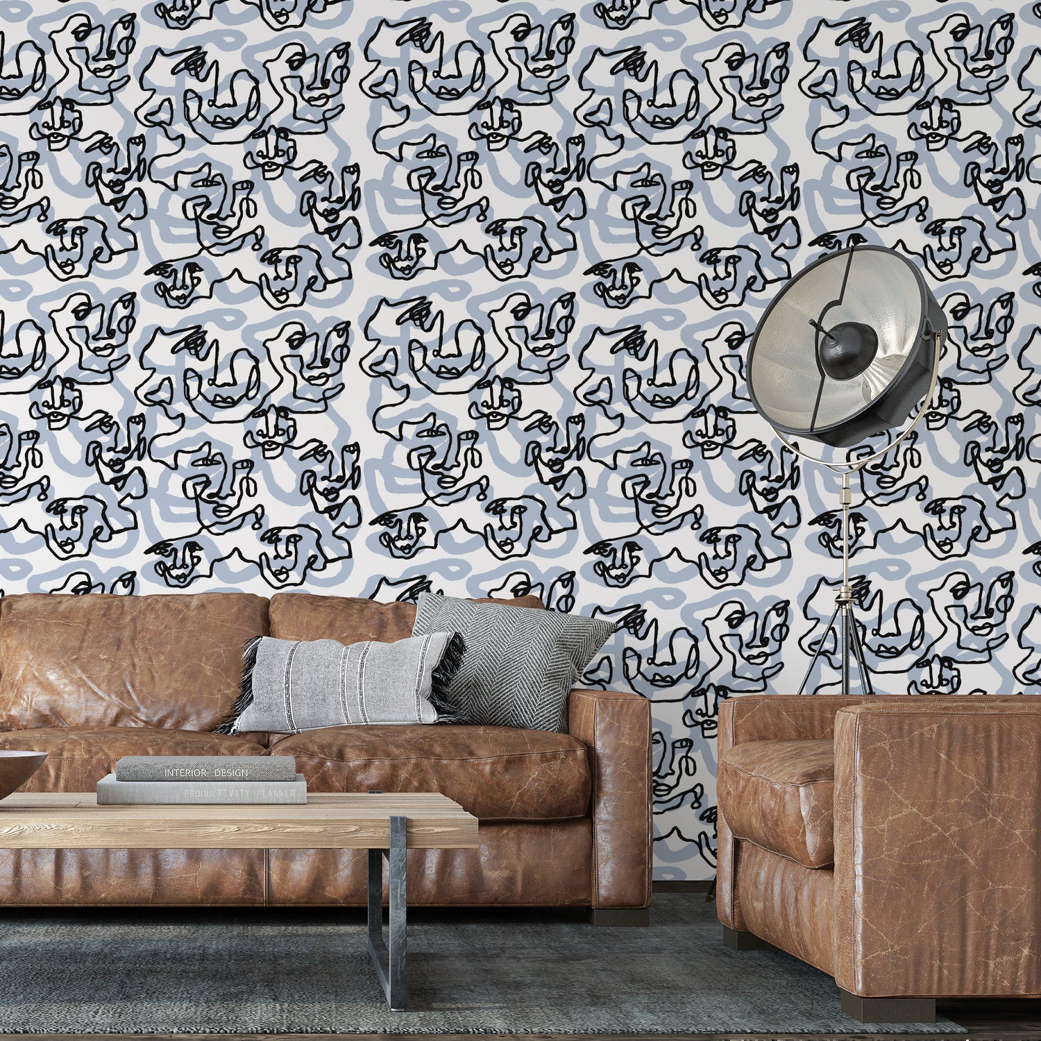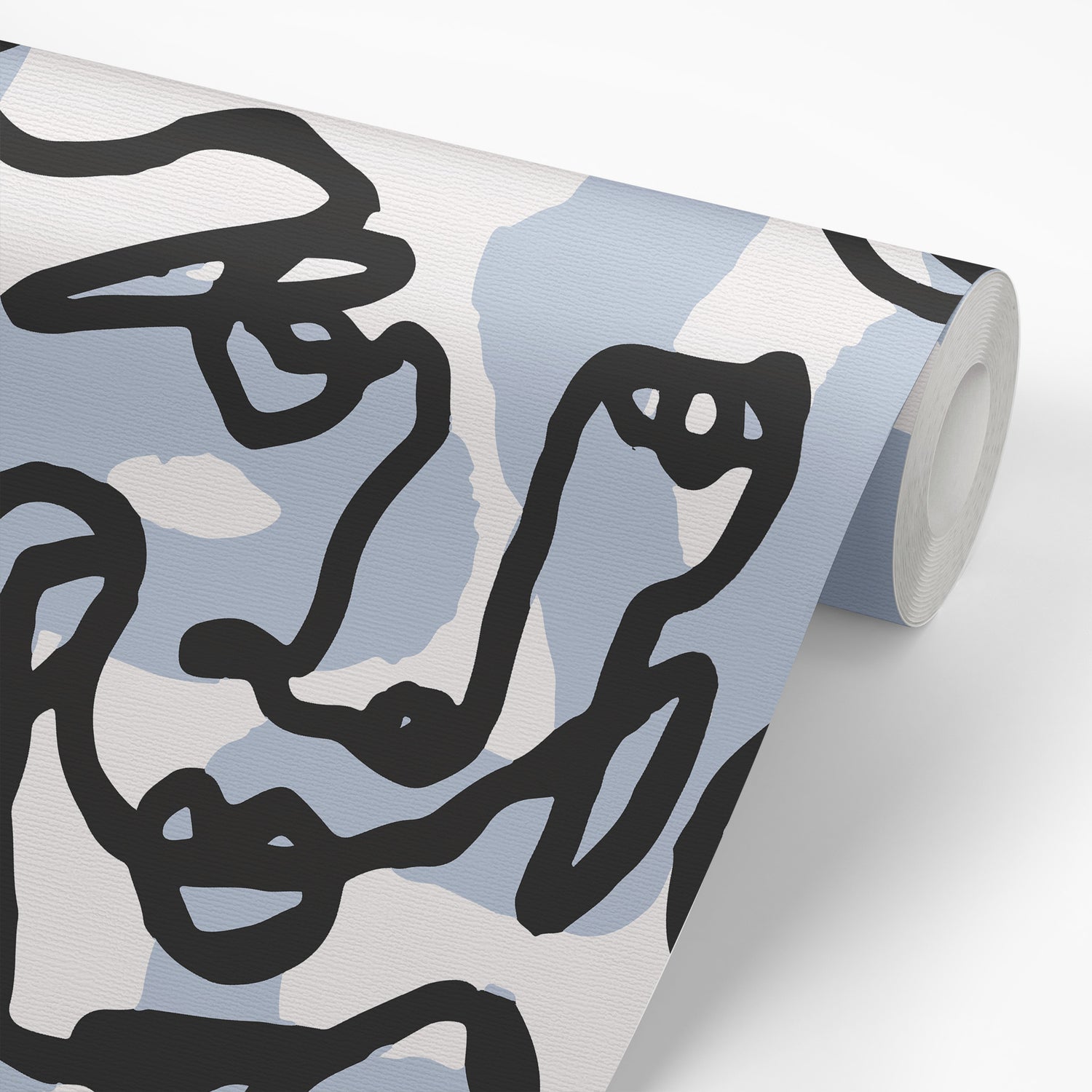 Transform your interior with La Cara wallpaper in blue. This design is exclusive to Ayara by creative artist Parker Heath of PAR KER made and features abstract faces drawn in black against a blue background. Both inventive and fresh, La Cara wallpaper will give your walls a bold, modern look. Experience true artistry in your home today with La Cara.