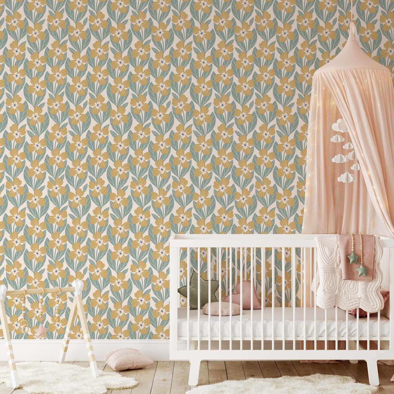 This Garden Poppies wallpaper is from our Artist Collection and was designed by Gabriela Dachin. Garden poppies done in yellow and sage scattered across a wall makes a beautiful statement.