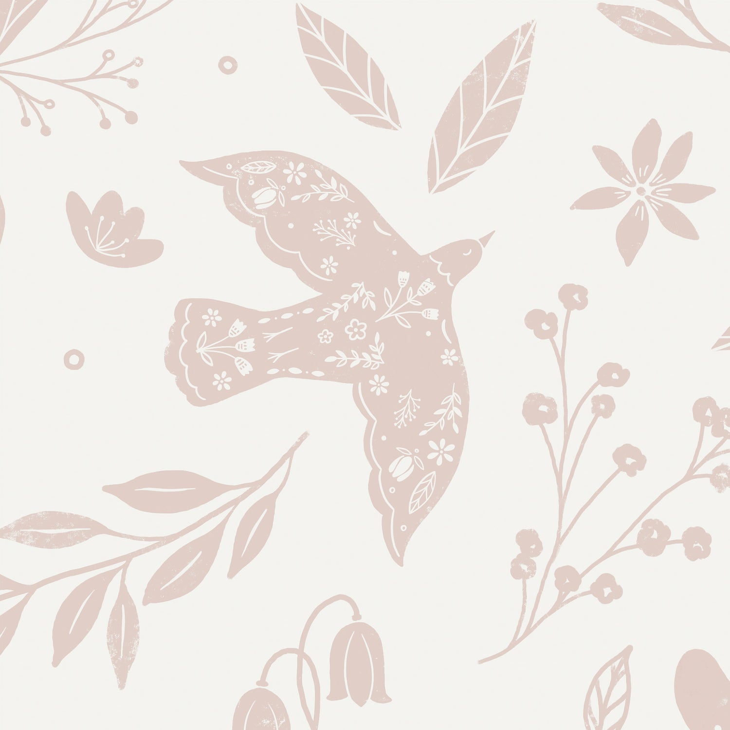 Add a vintage folk feel to your space with our Dove of Peace Wallpaper in Pink! Featuring hand-drawn folk florals, branches, and doves in a soft pink hue, this wallpaper is perfect for creating a serene and playful atmosphere.