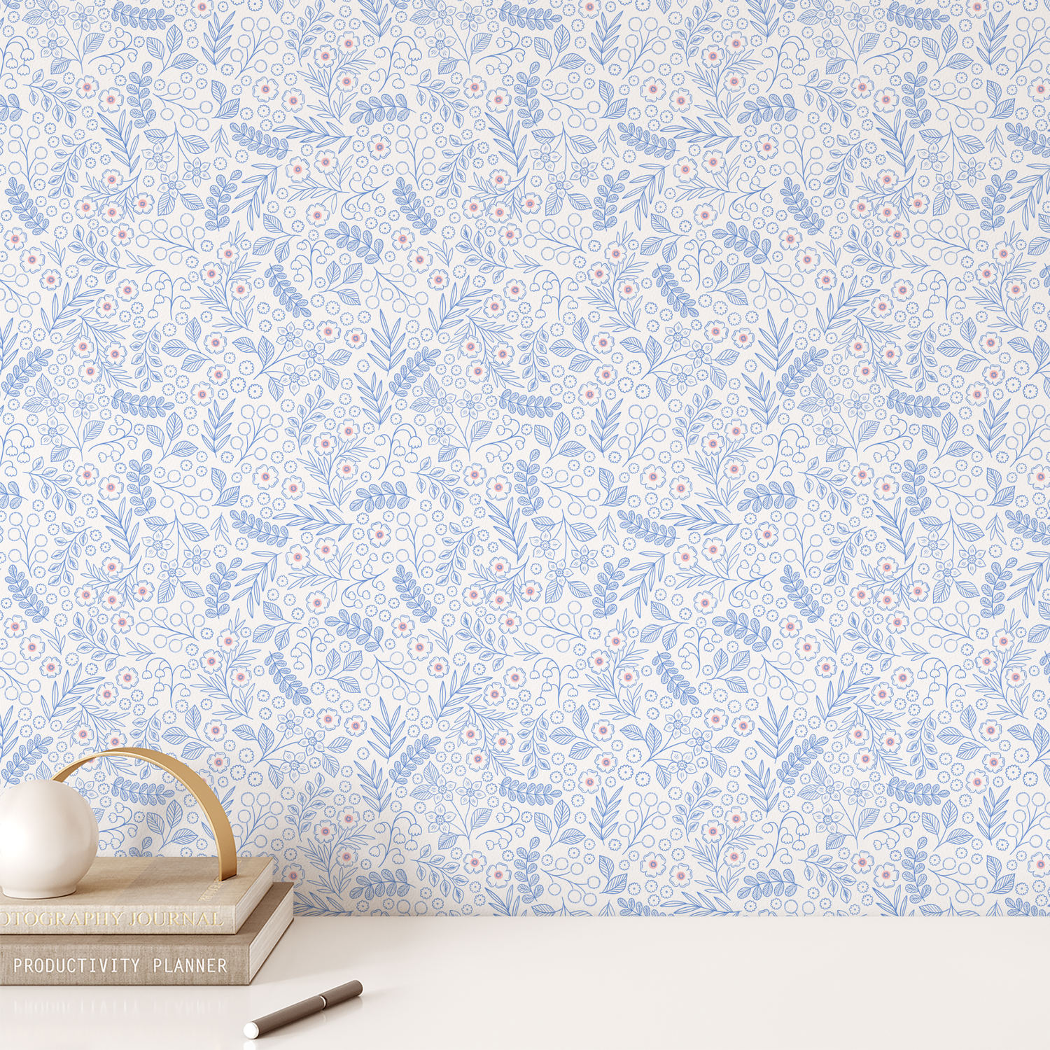 This Fields wallpaper is from our Artist Collection and was designed by Paper Raven Co. Beautifully designed this soothing foliage pattern done in periwinkle is a classic.