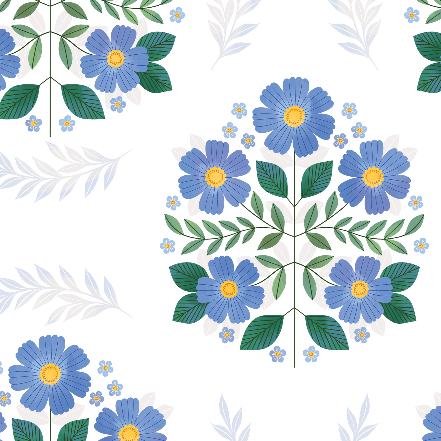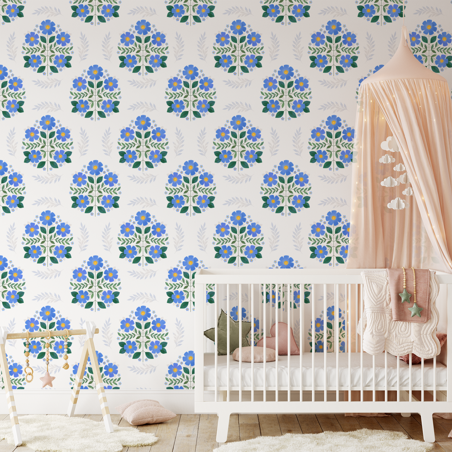 This Folk Florals wallpaper is from our Artist Collection and was designed by Paper Raven Co. Make a statement with this intricate artistry that is shown in china blue.