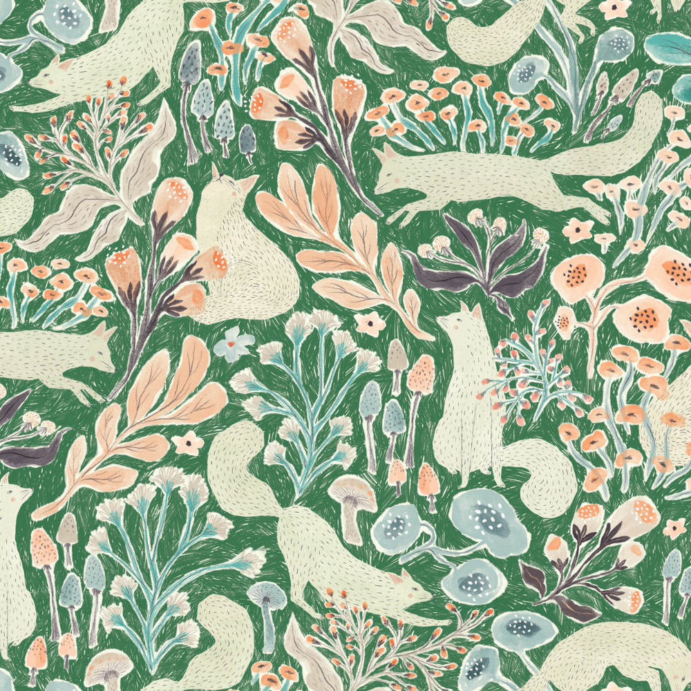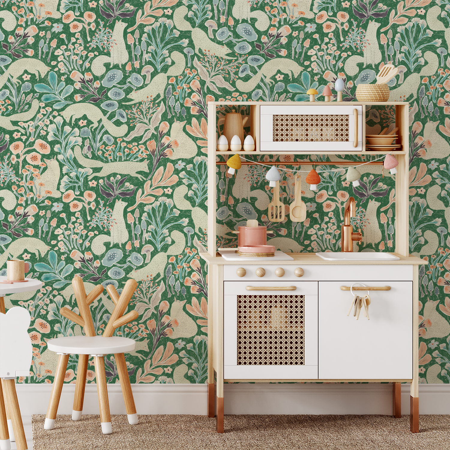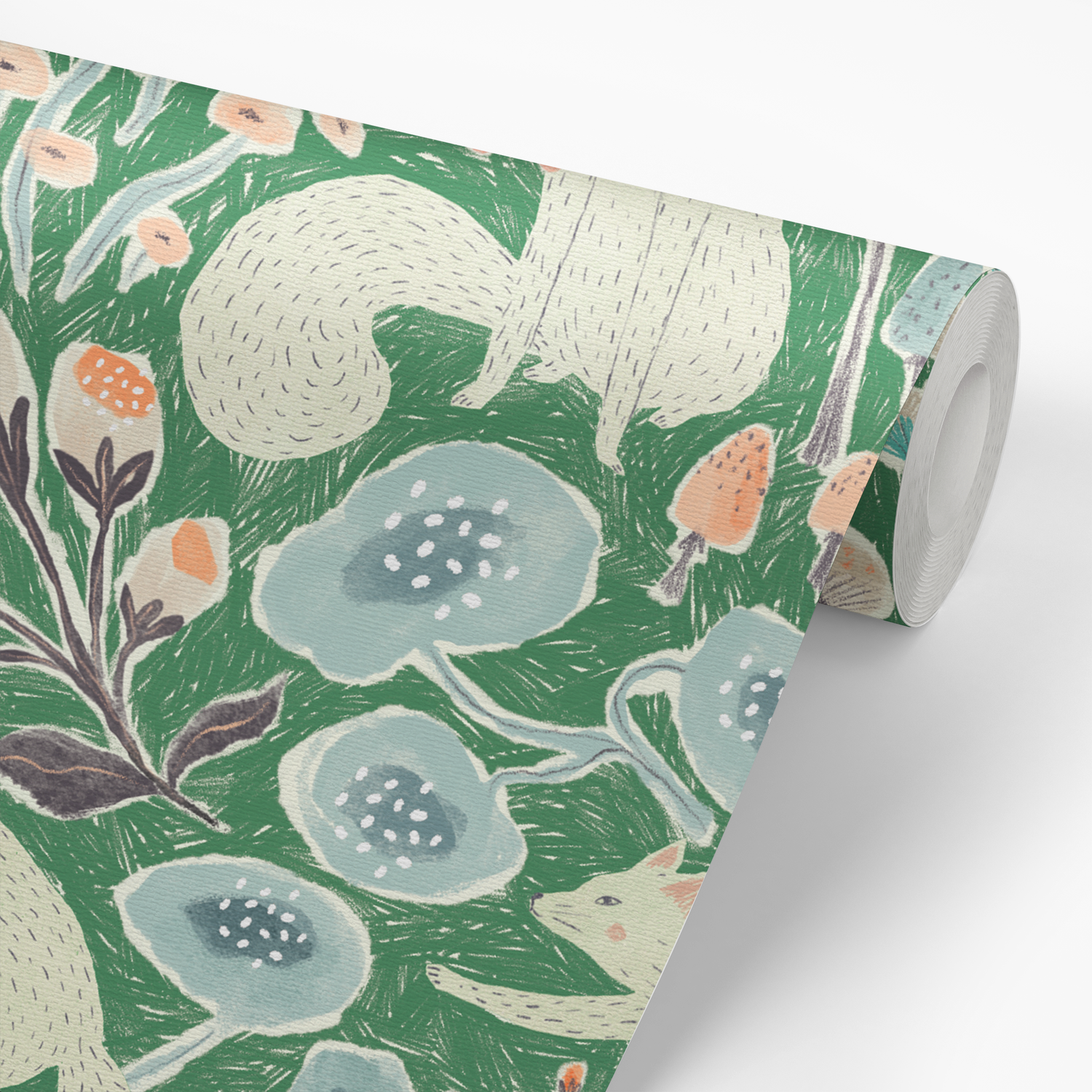 This Fox Friends wallpaper is from our Artist Collection and was designed by Jill Labieniec. Beautifully designed and orchestrated colors that combine an emerald green background complete with animals, foliage, and soft florals.