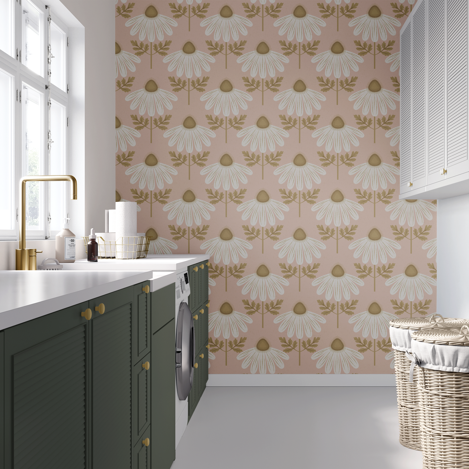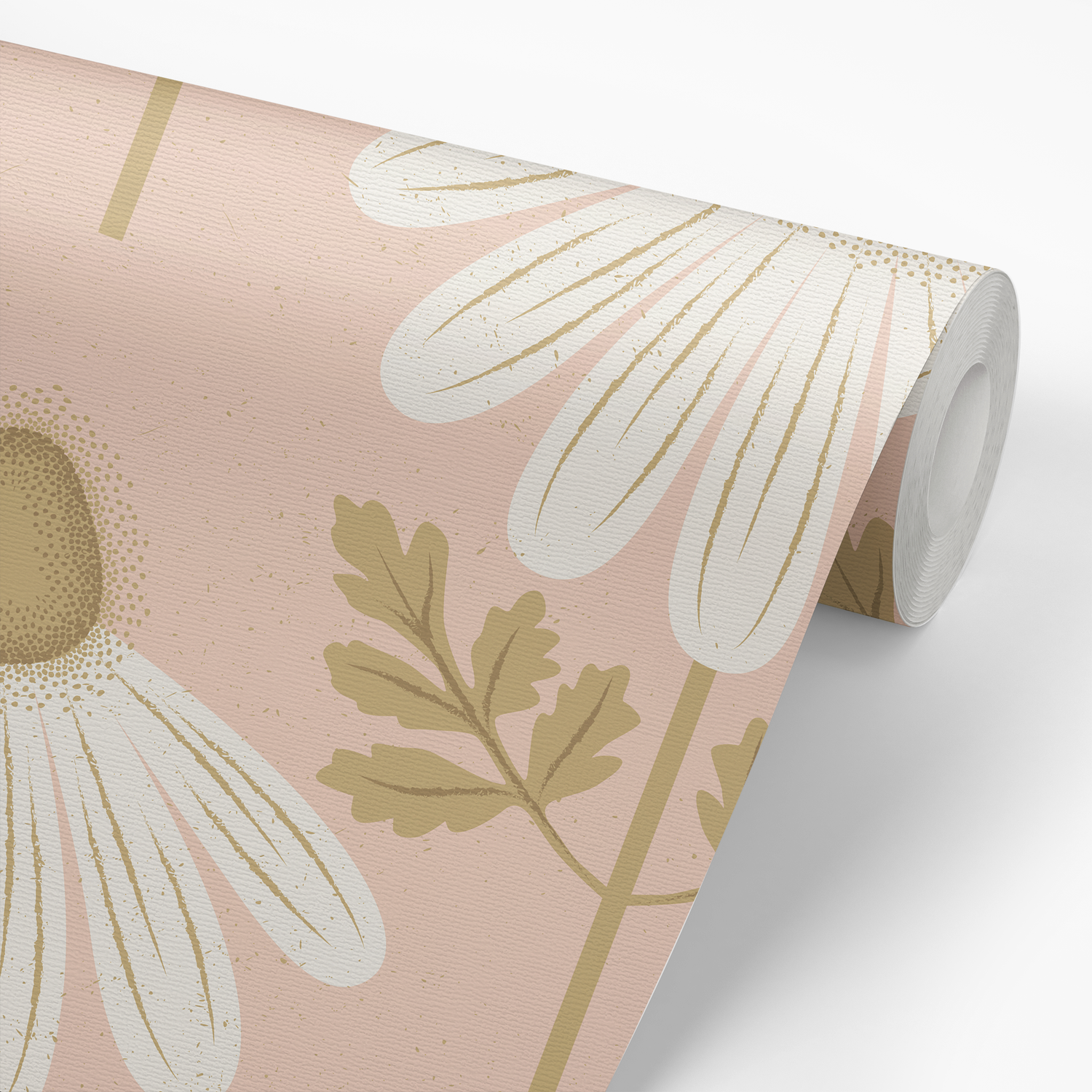 This Good Luck Daisy wallpaper is from our Artist Collection and was designed by Mercedes Cortes. Large scaled daises and unique artistry make this bold statement pattern a stand out in any space.