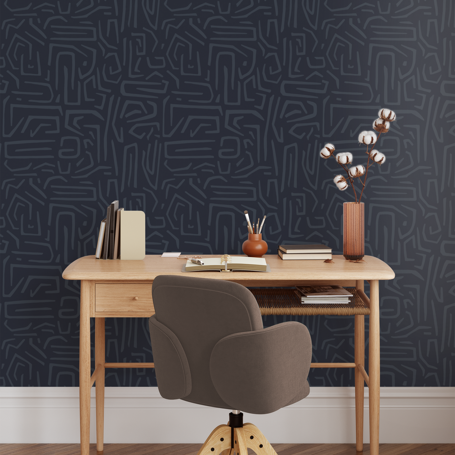 This Modern Maze wallpaper is from our Artist Collection and was designed by Frost Design Co. Created for our masculine collection, this modern design features abstract shapes in dark gray. View the entire Frost Design Co. x Ayara collection here.