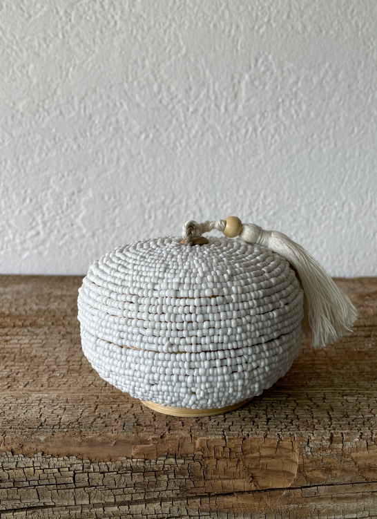 Our Naya beaded tassel round box shown here in white is handmade with delicate precision.