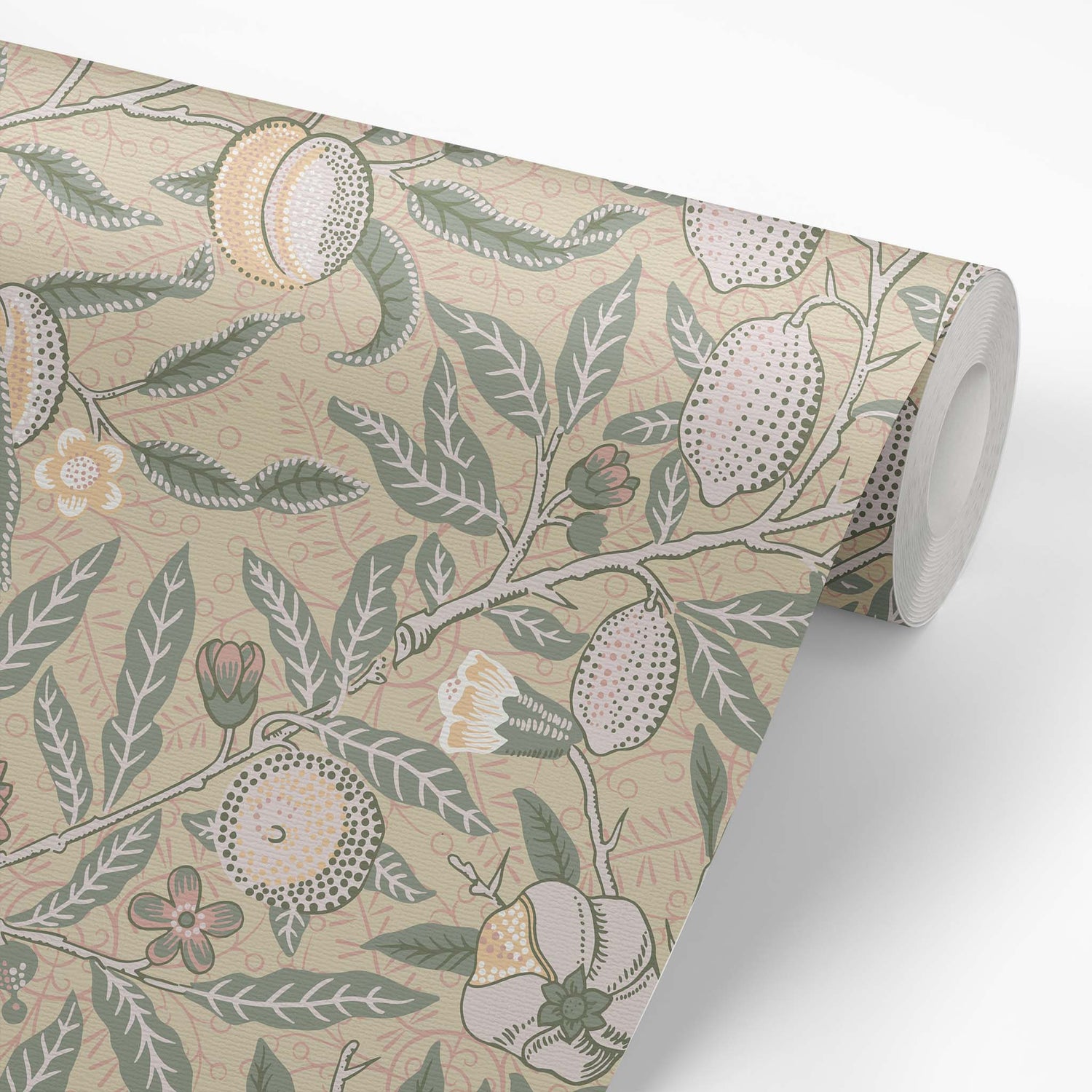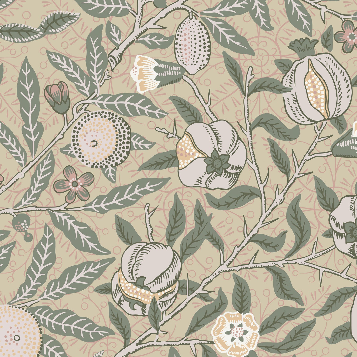 This Pomegranate Wallpaper features tans, golds, and greens and is from our Heirloom collection. You'll love the fruitfully displayed pomegranates amid the leaves, branches, and greenery.