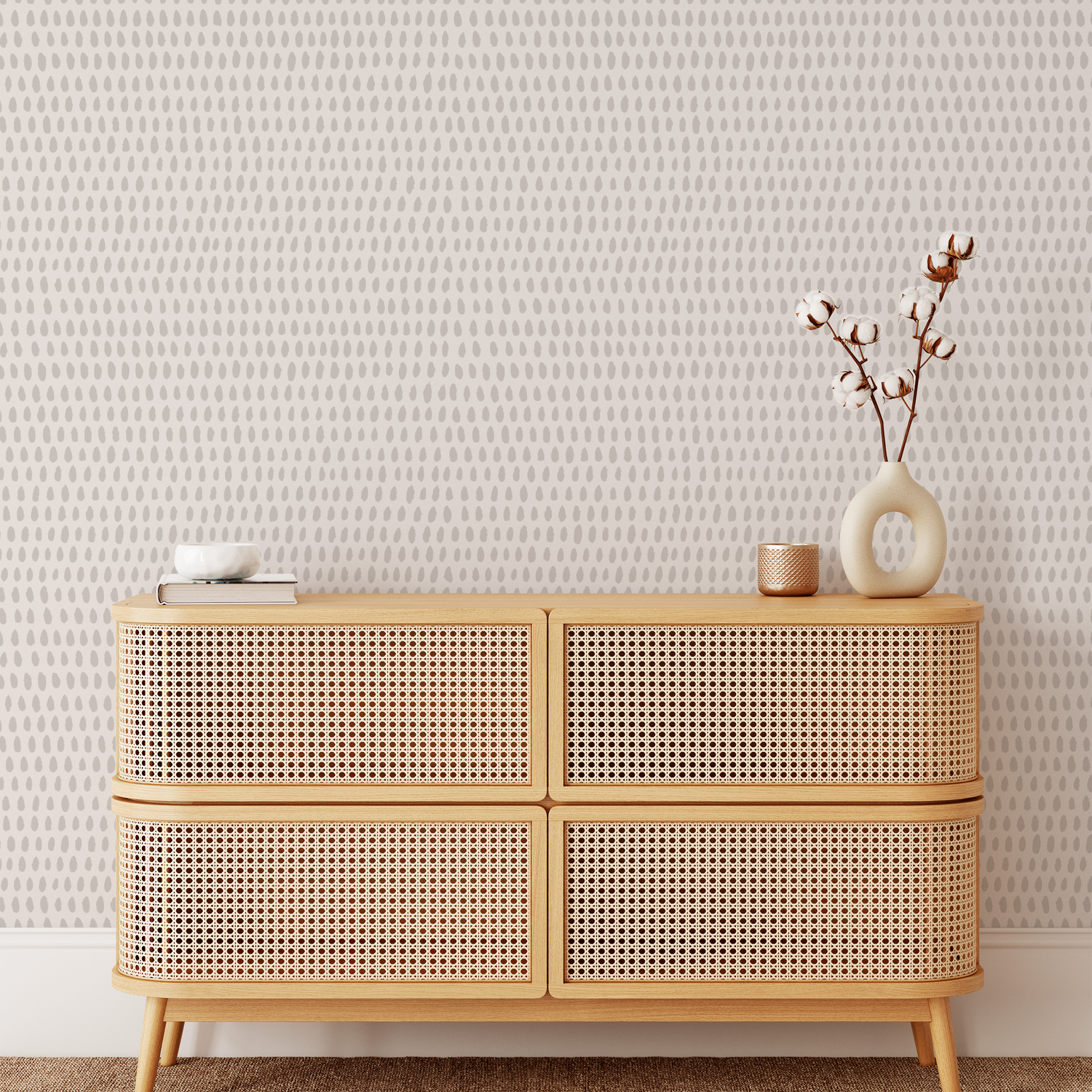 This Rain wallpaper is from our Artist Collection and was designed by House of Springer. Beautifully illustrated this simple repeated design done in warm greige drops is a must for your space.