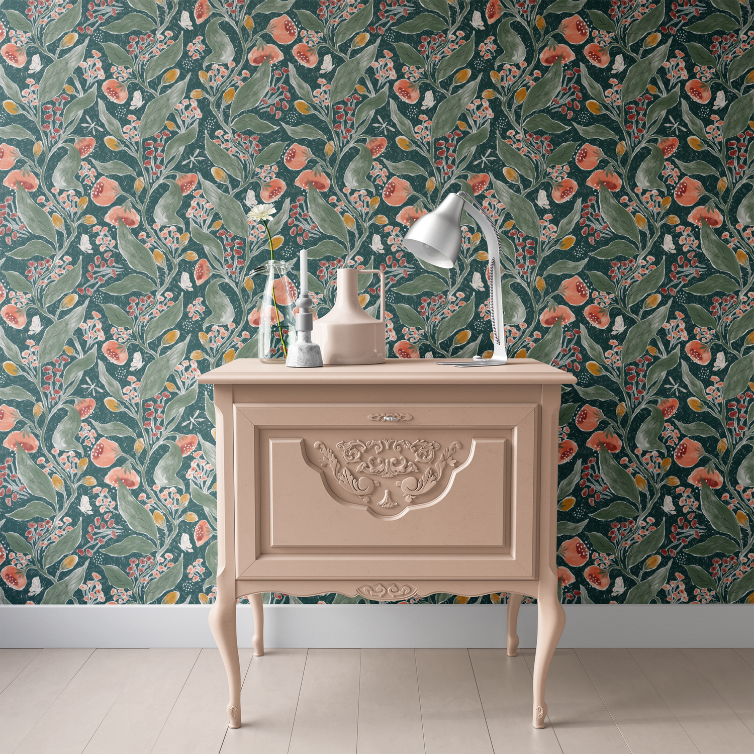 This Rose Garden wallpaper is from our Artist Collection and was designed by Jill Labieniec. A classic rose garden design in emerald will freshen up any space in your home.