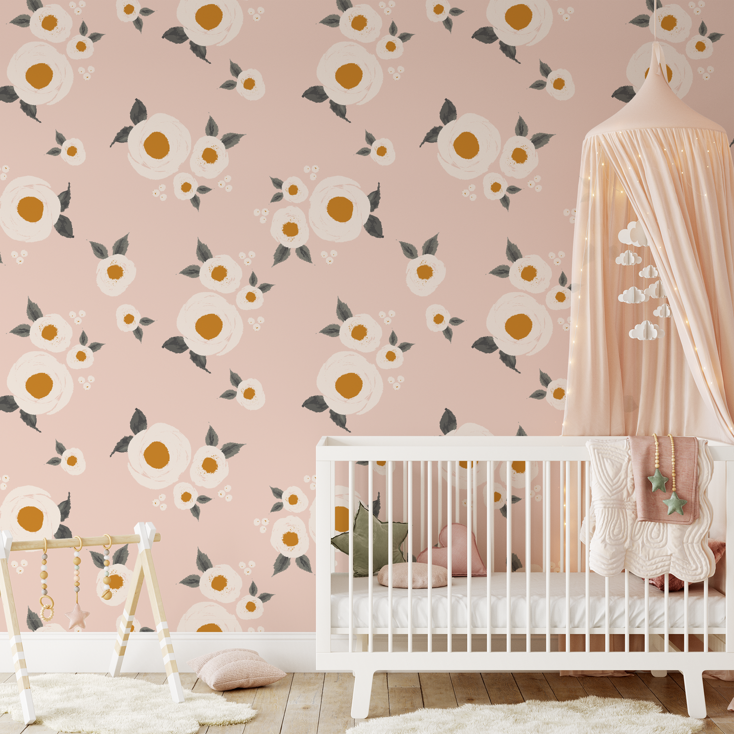 This Roses wallpaper is from our Artist Collection and was designed by Gabriela Dachin. A modern twist to pink roses with vibrant terracotta centers complete with tan and green colorlays.