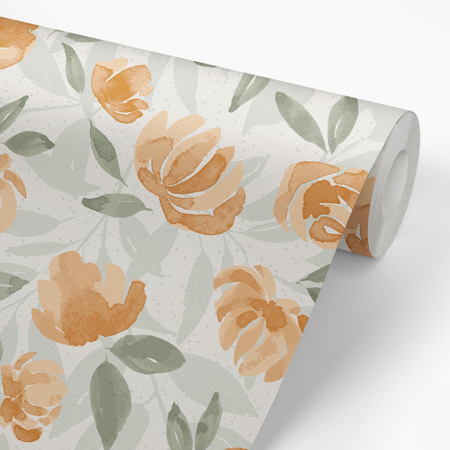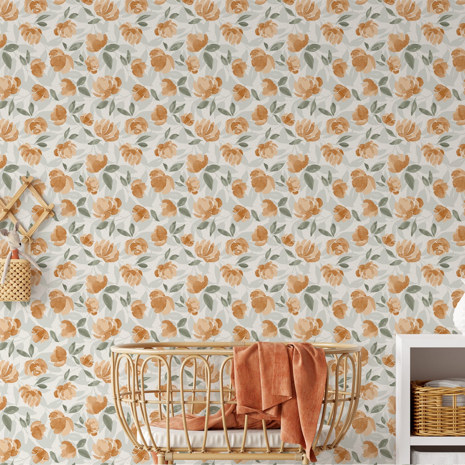 This Sunset Glow wallpaper is from our Artist Collection and was designed by Gabriela Dachin. This gorgeous floral celebration done in peach and greens brings happiness to any space.
