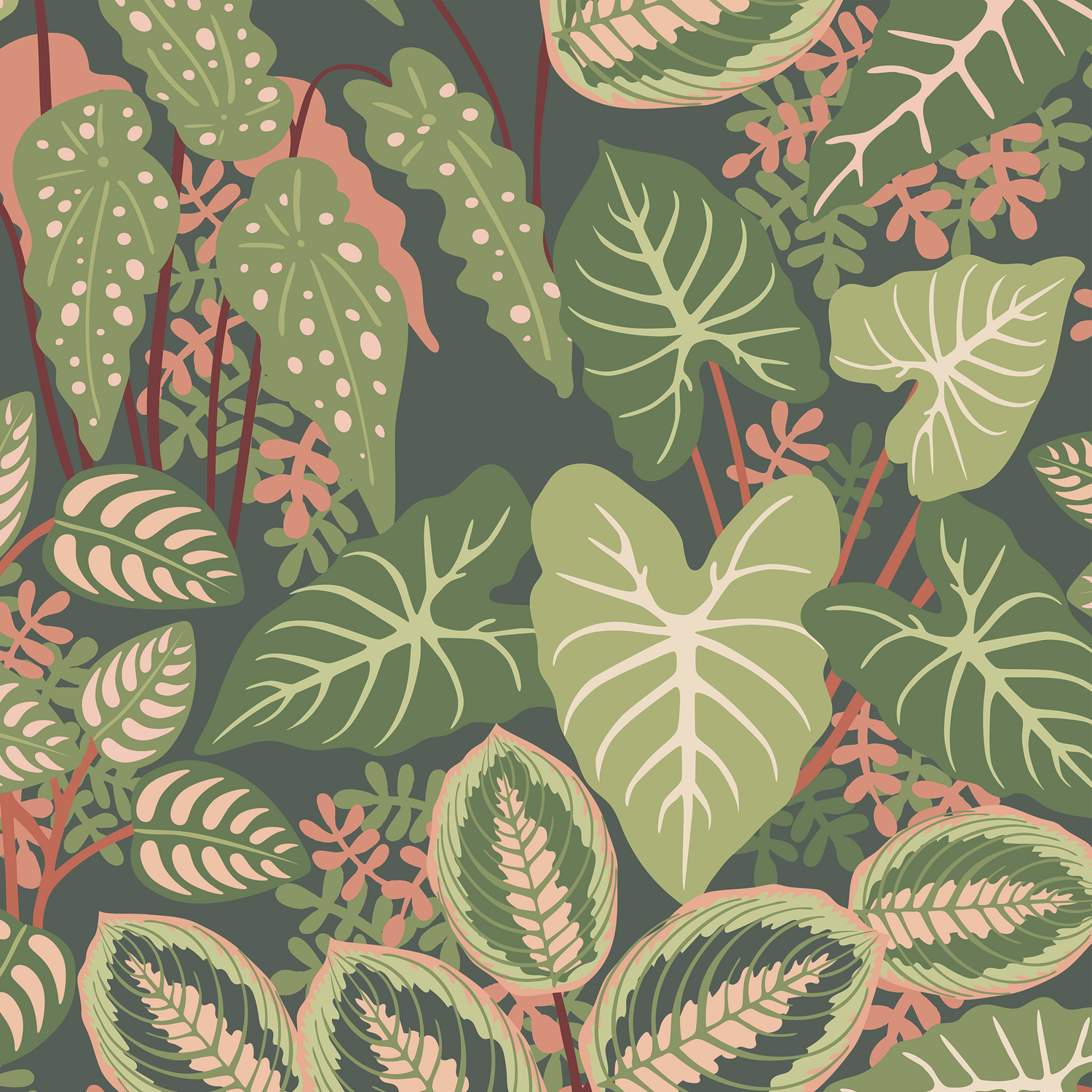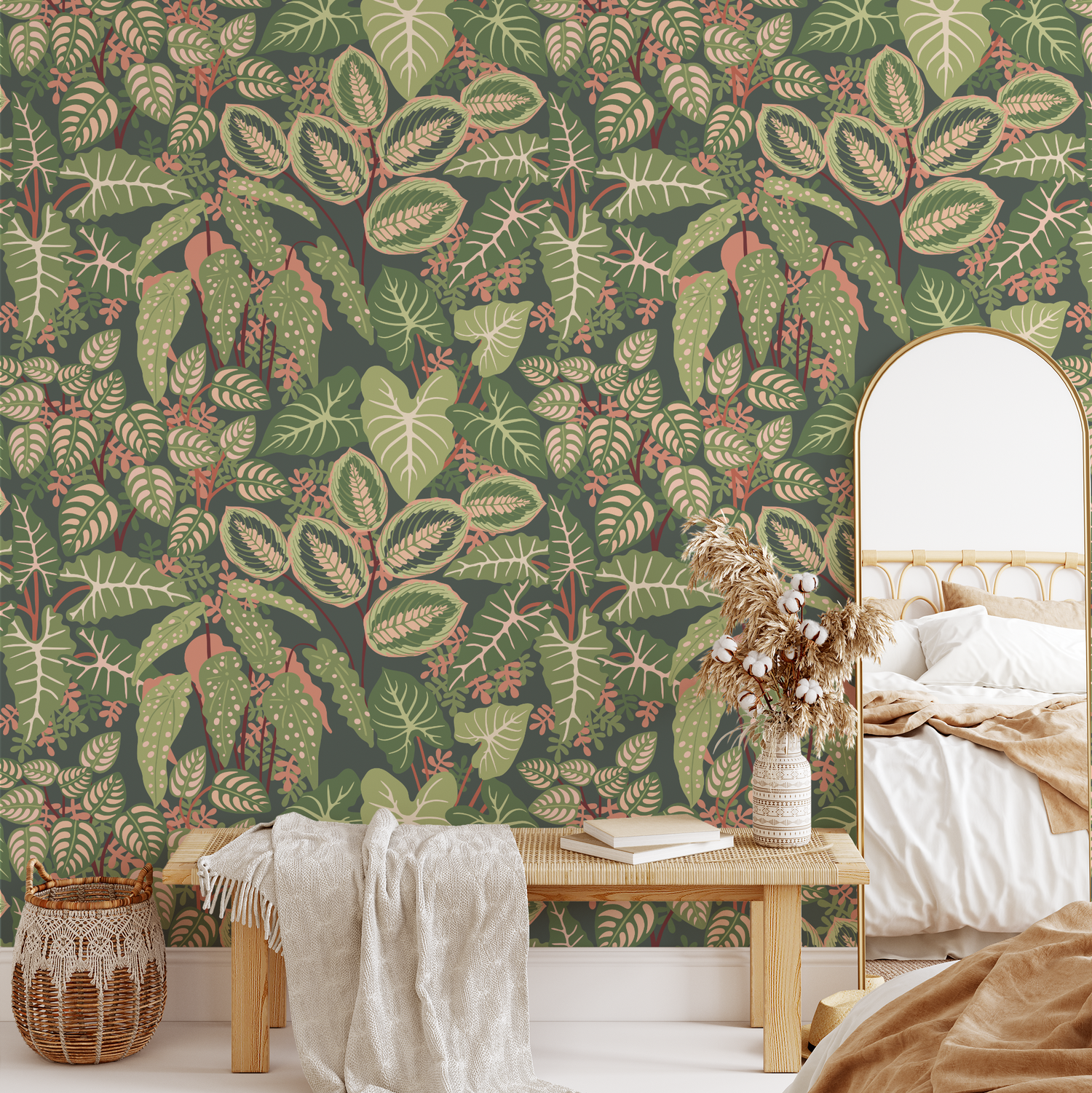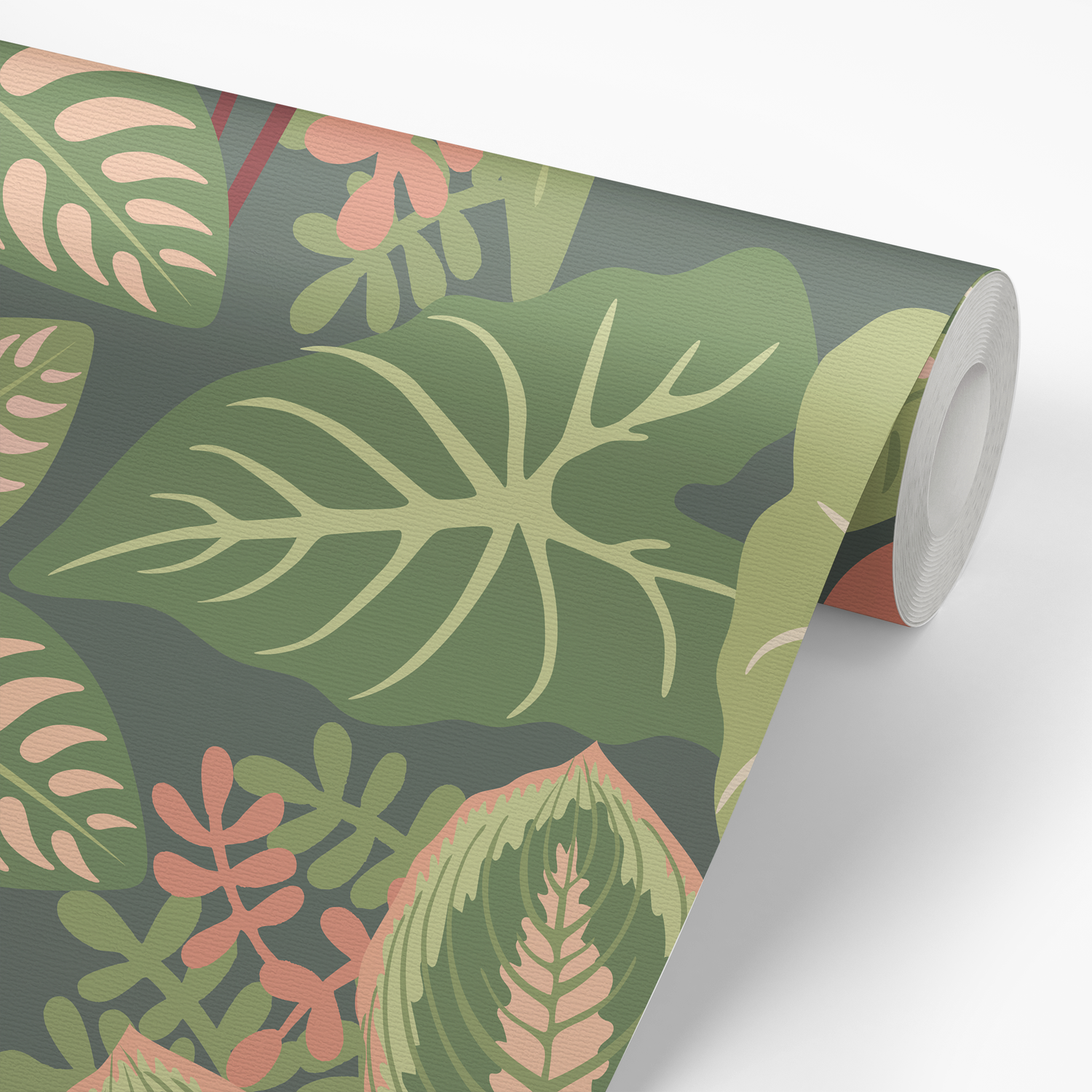 This Tropical Leaves wallpaper is from our Artist Collection and was designed by Mercedes Cortes. A botanical garden featuring foliage and different color lays is shown here in green.