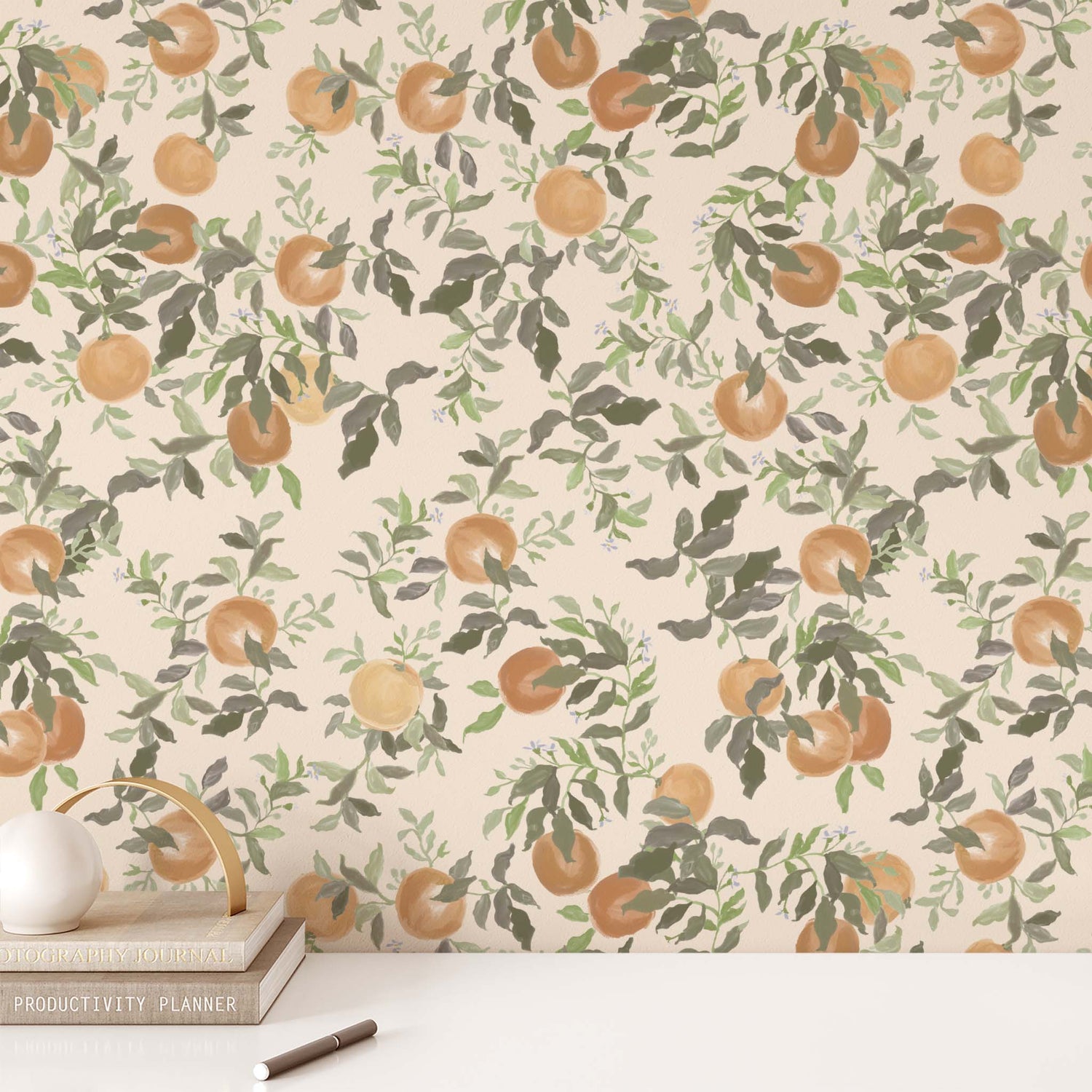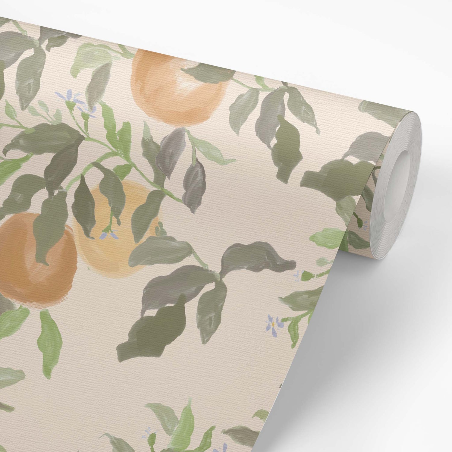 Introducing our Valencia Wallpaper, a citrus-inspired design perfect for any space. Adorned with delicate oranges and leaves, this wallpaper has a beautiful palette of orange, soft yellow, tan and a touch of blue. Bring the beauty of nature indoors and create a calming oasis with our Valencia Wallpaper.